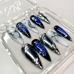 Step into the future with these futuristic silver and navy press-on nails, featuring abstract chrome detailing and sleek 3D designs. The metallic accents create a bold contrast on deep navy and ivory bases, making each nail a tiny work of art. Perfect for fashion-forward looks, special events, or cosmic vibes. Reusable and easy to apply…